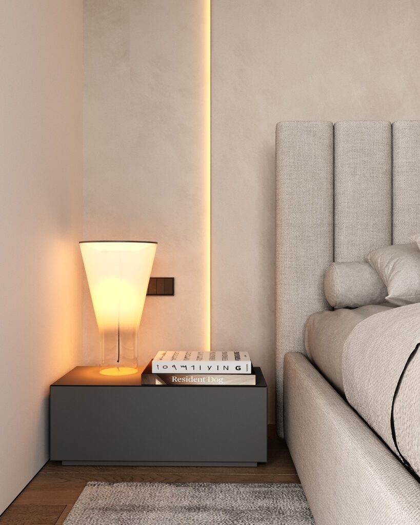 In the living room, we used wood on the sloped ceilings, another authentic material, and added subtle backlighting and elegant lighting fixtures, creating a play of light and shadow in the interior.