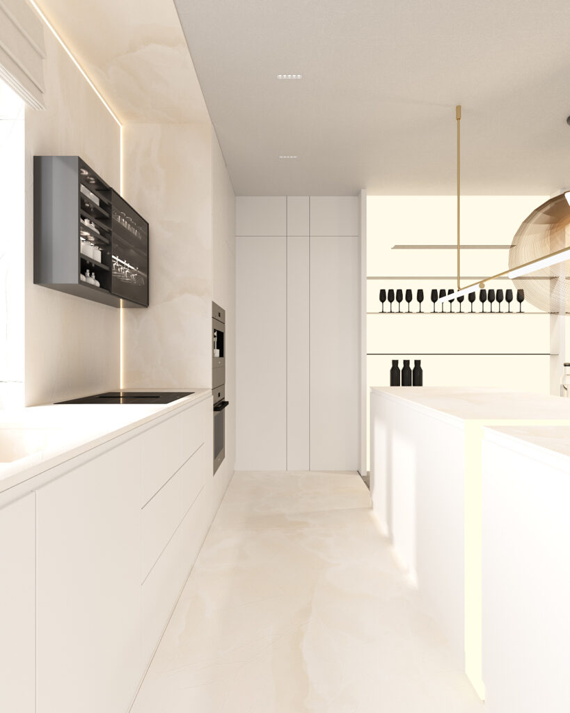 Ten wyjątkowy apartament został zaprojektowany z myślą o potrzebach jego mieszkańców, łącząc nowoczesny design z maksymalnym wykorzystaniem przestrzeni. Jego atutem jest duży, otwarty salon połączony z kuchnią, gdzie centralnym punktem stała się wyspa zintegrowana z eleganckim stołem jadalnianym. Taki układ sprzyja zarówno codziennym posiłkom, jak i spotkaniom w gronie rodziny i przyjaciół.